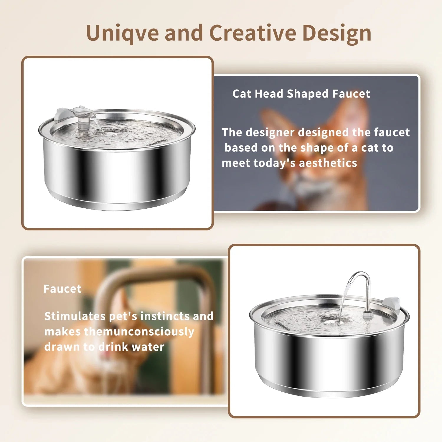 The cat water fountain is made of 304 stainless steel, and more durable and orrosion resistant. BPA free and dishwasher safe, easy to clean.